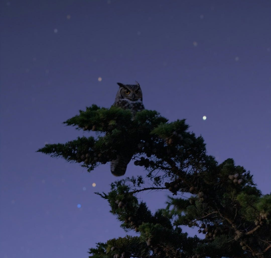 blue stars, noon moon. Scatters atoms, day, parts particles: Saturn skulked, horned horizon. See houses mousing holes trees breezing shadows. See shades unmade, meadows meander, cows mouths, cut, cud chewed, ruminant spewed. Clouds sloughing sundown's ferment, drowned firmament: owls rising, fervent prising, who who?